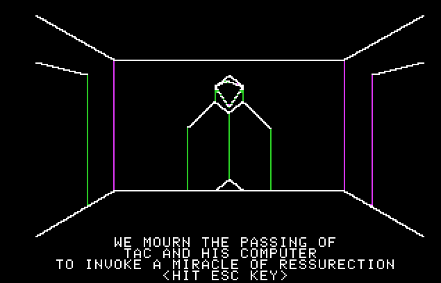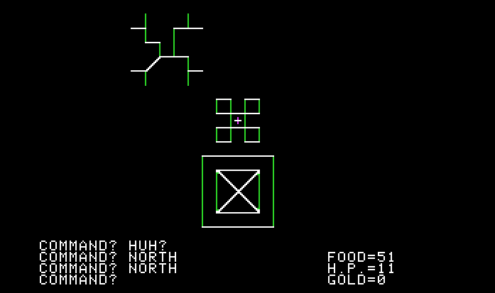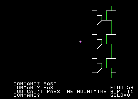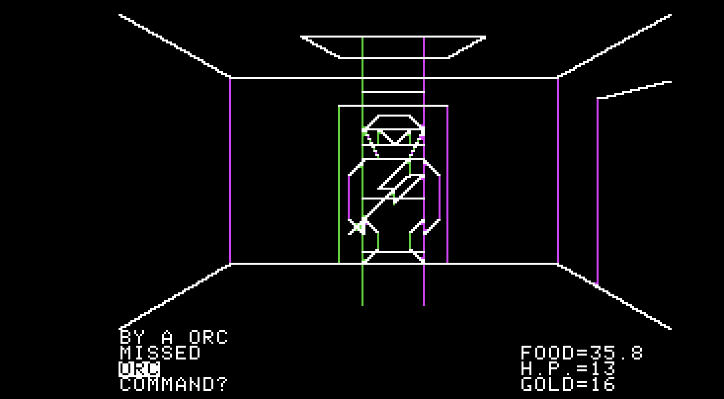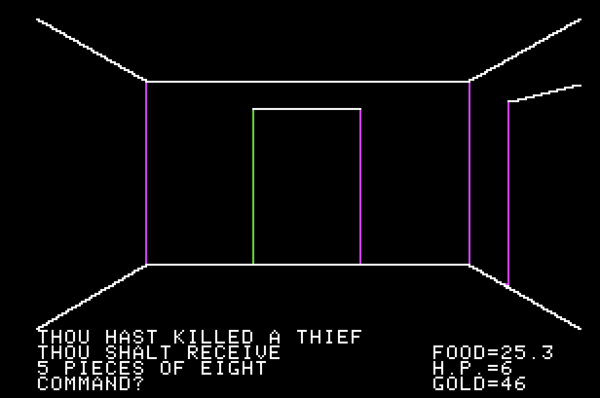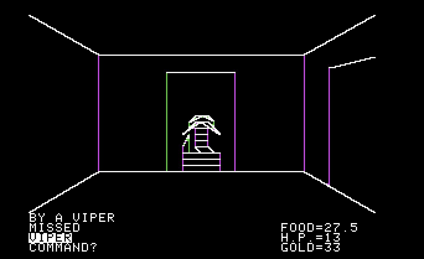 The overland map features crude renderings of mountains, structures and the all-important dungeon. Each move in the surface world costs one food … which causes problems far more quickly than one might think. When you venture into a dungeon, it switches to a simple, first-person, 3D view. It’s the Apple II, so the renderings are exceptionally crude, but in 1980 they got the job done.